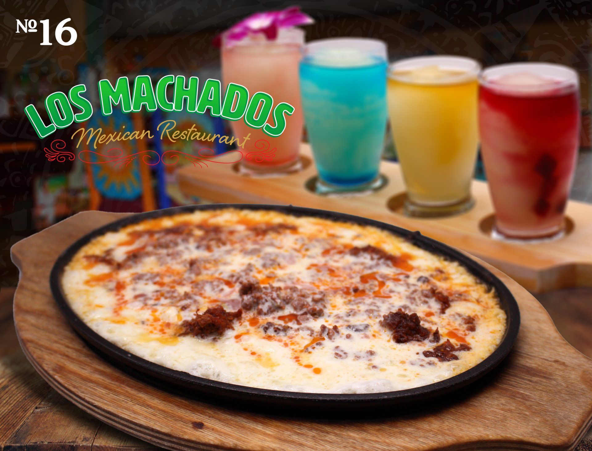 Steak, Grilled Chicken and Shrimp covered with Pico de gallo and Cheese dip.