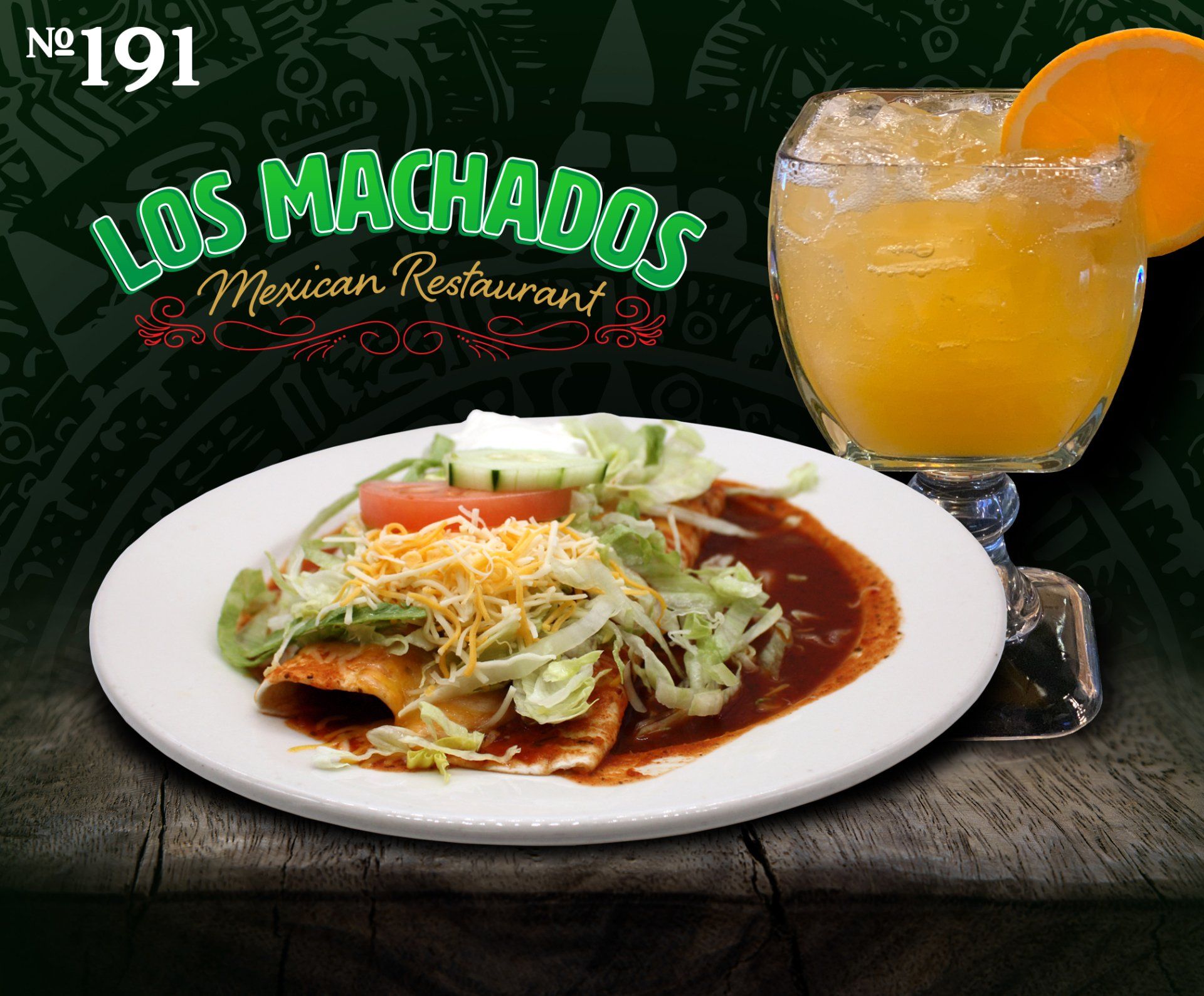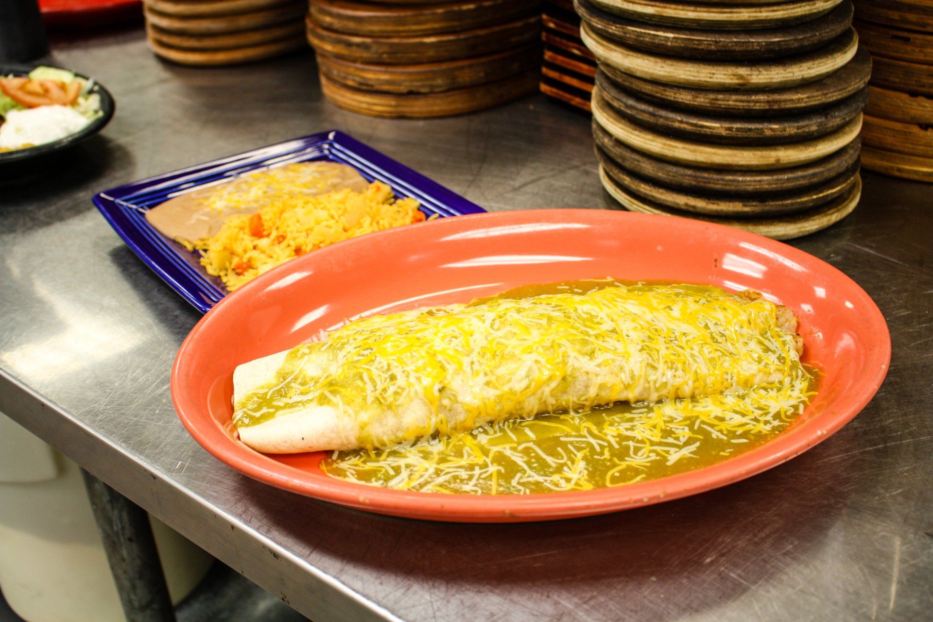 Two burritos filled with beef tips & beans, covered with red sauce & cheese sauce. Topped with lettuce, tomato & sour cream Served with rice & beans on the side.