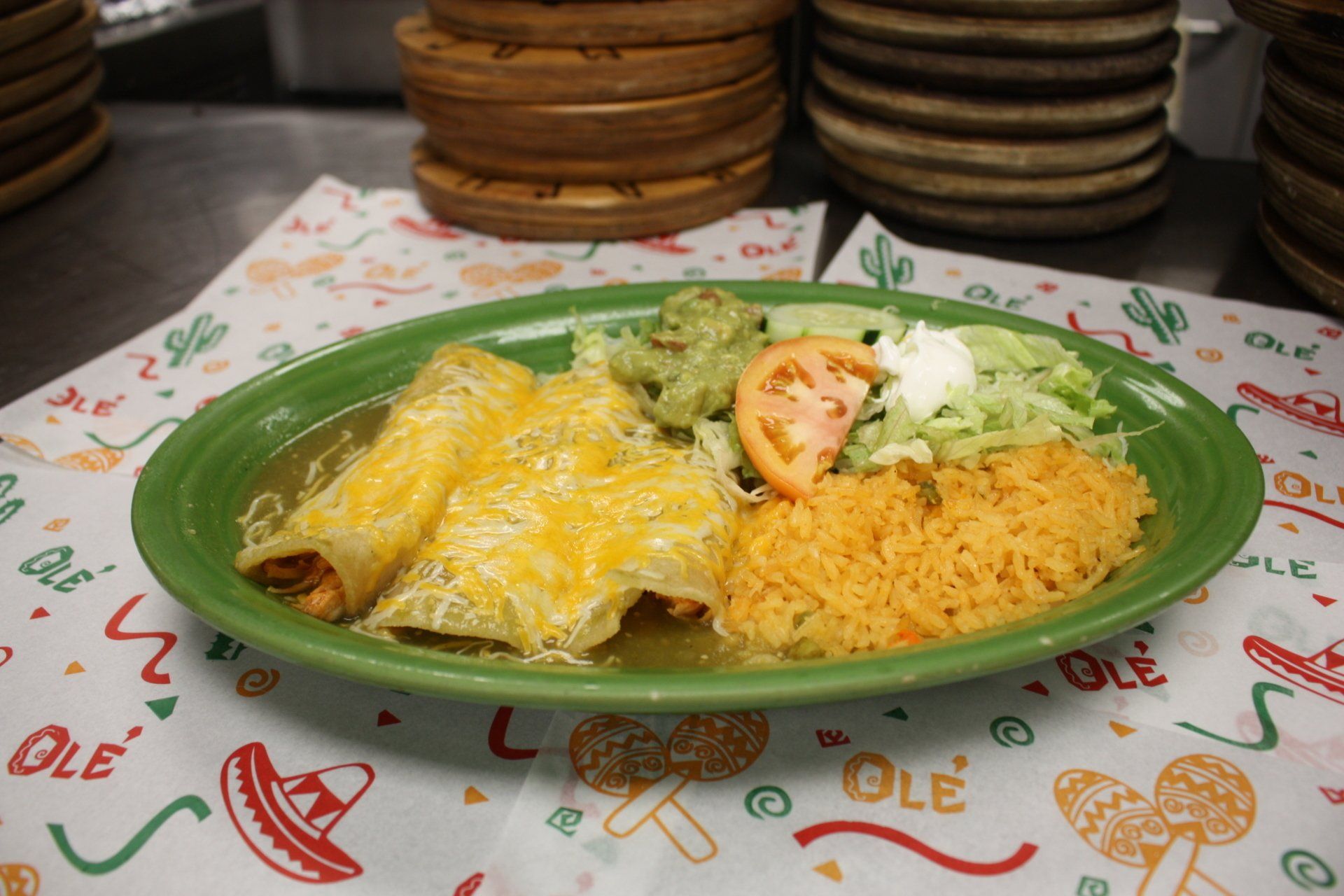 Three chicken enchiladas covered with tomatillo sauce & cheese. Served with rice & Mexican salad.