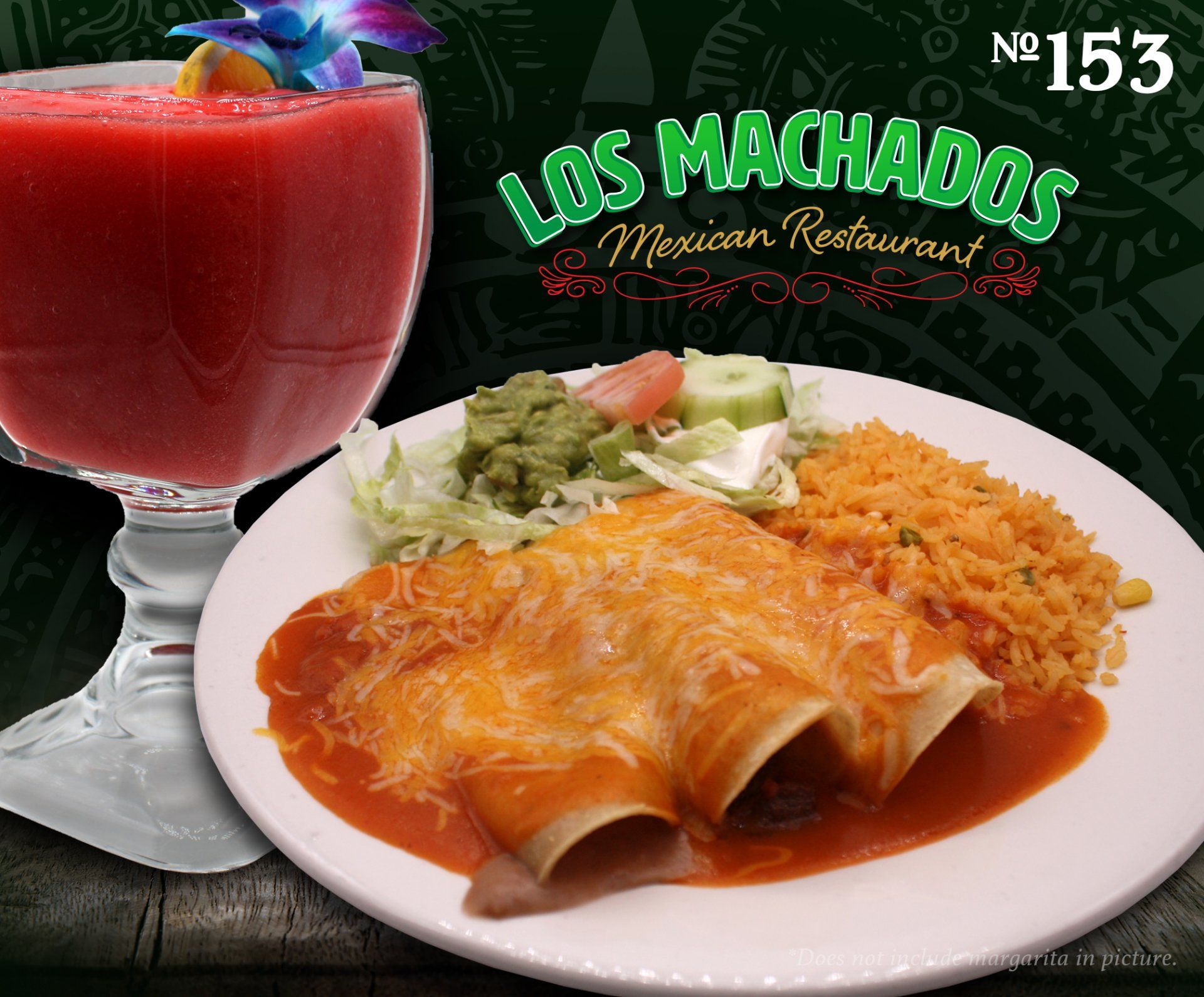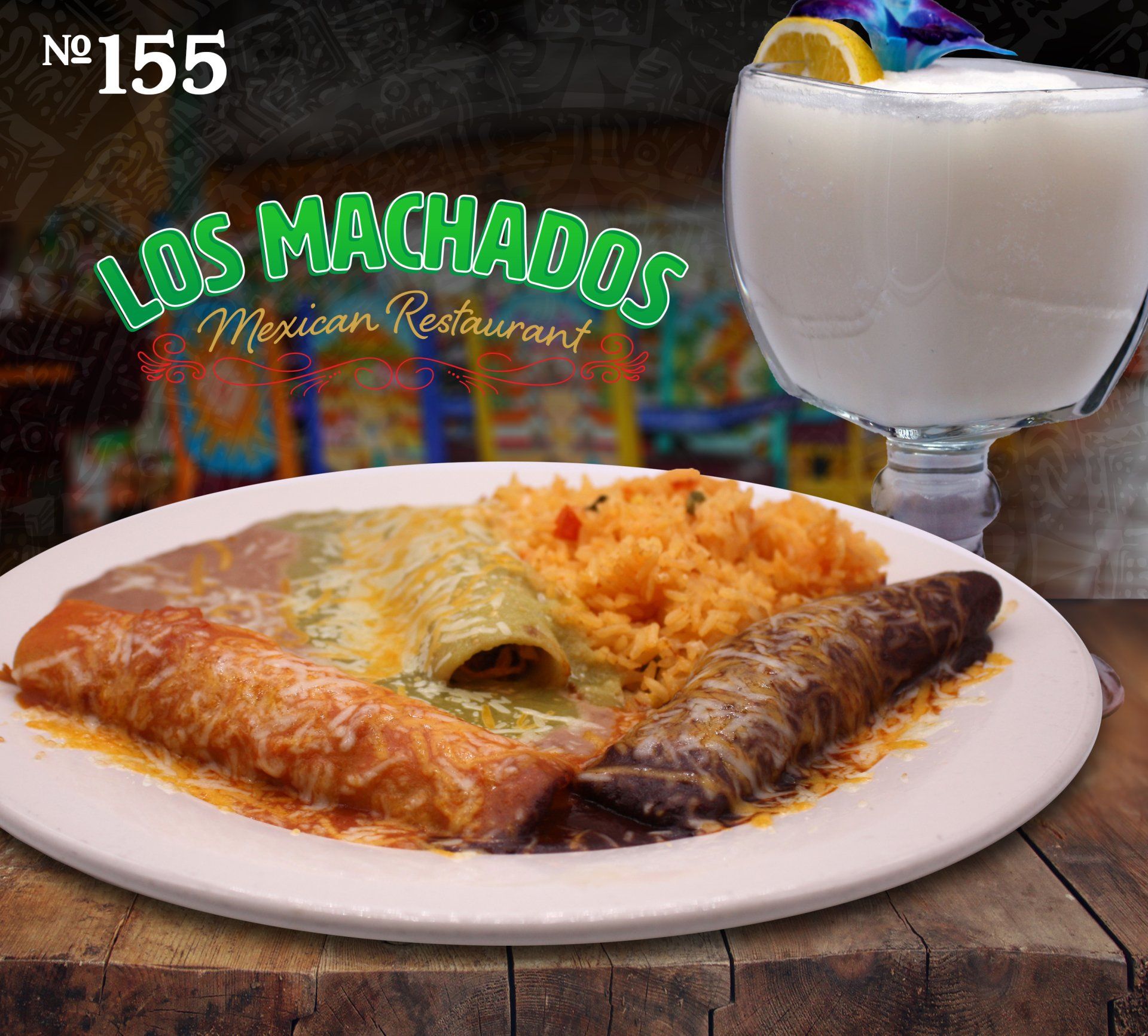 One chicken enchilada with tomatillo sauce. One chicken enchilada with poblano sauce, One chicken enchilada with red sauce. Served with rice & beans.