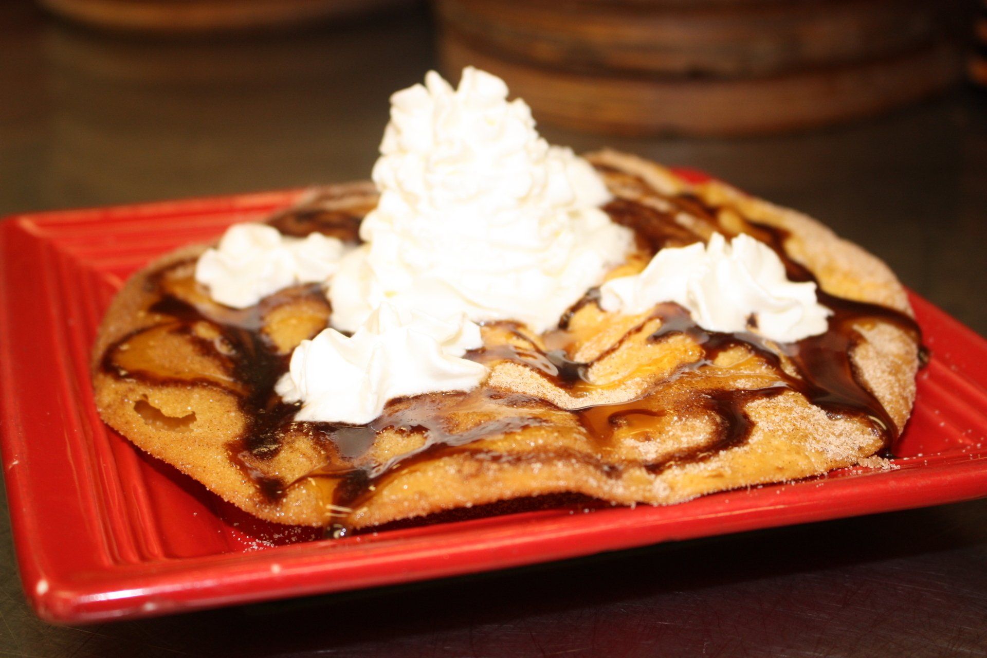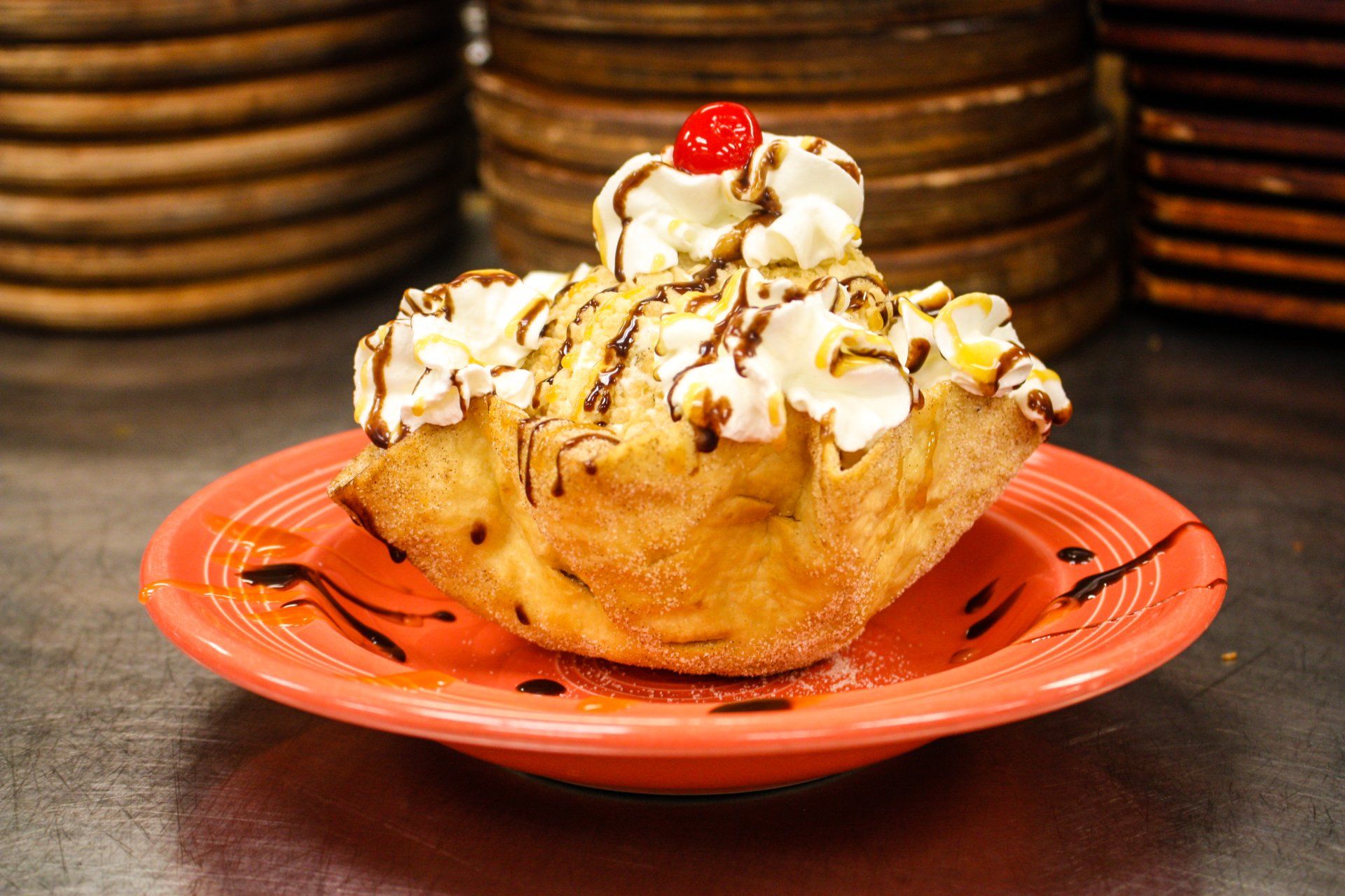 Vanilla ice cream covered with rice krispies. Served with whipped cream, caramel, cinnamon, chocolate and cherry on top.