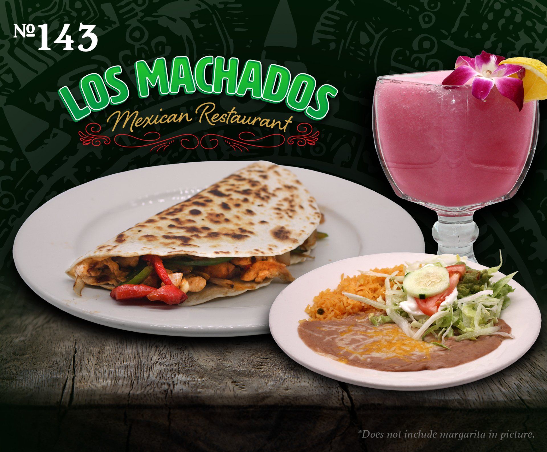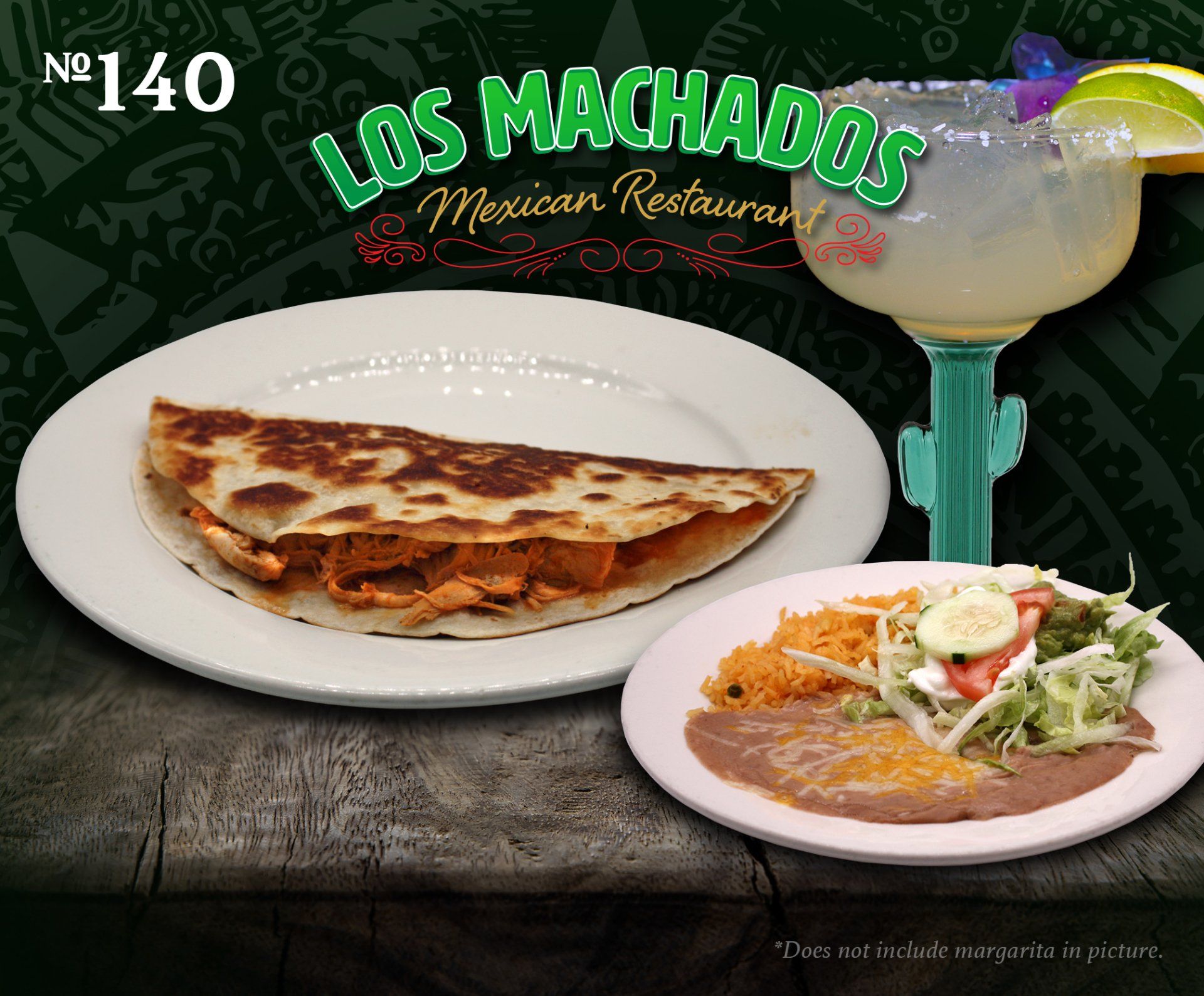 One flour tortilla with cheese and your choice of chicken or beef. Served with rice, beans and Mexican salad.