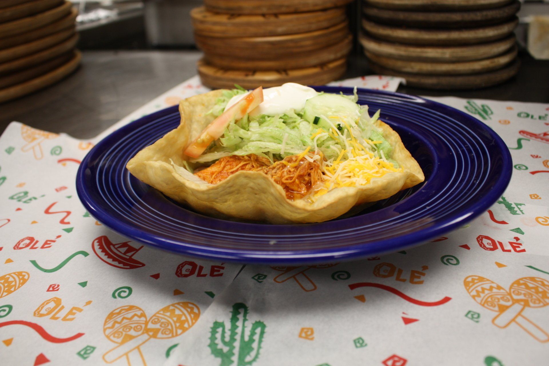 Chicken or beef with beans, cheese & a Mexican salad on top.