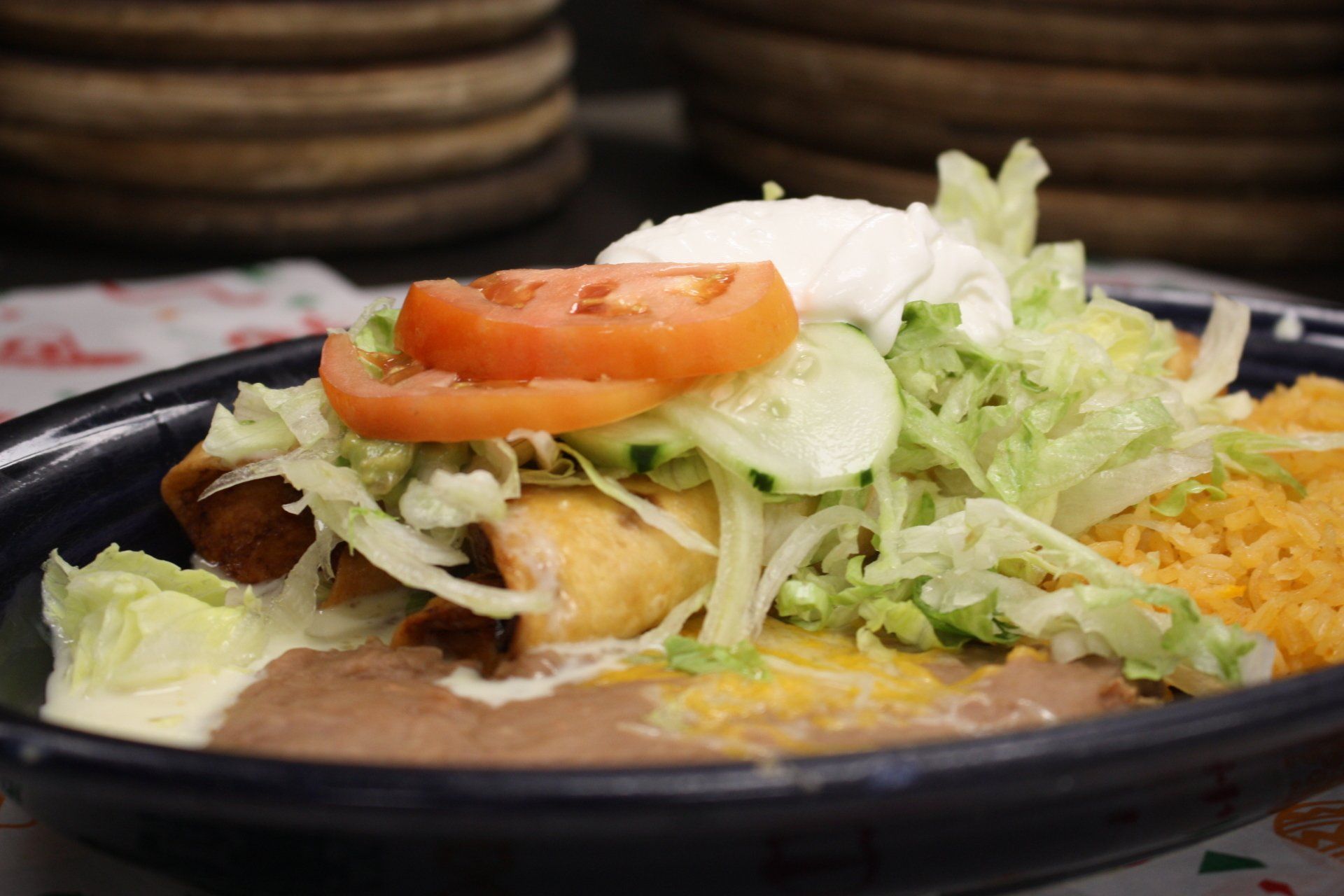 Two fried or soft tortillas with beef tips or shredded chicken, topped with lettuce, tomato, guacamole & sour cream. Served with beans.