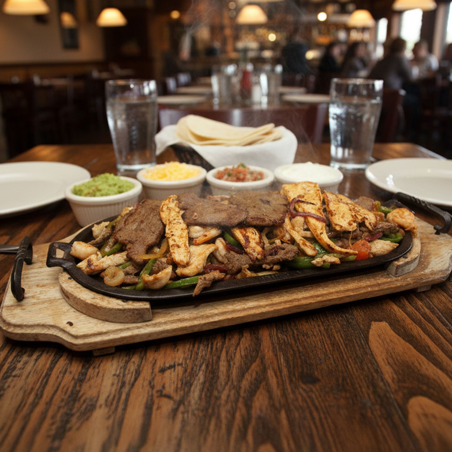 Carne asada, beef fajitas, chicken fajitas, Shrimp fajitas & jalapeños. Served over rice, beans with Mexican salad and tortillas.